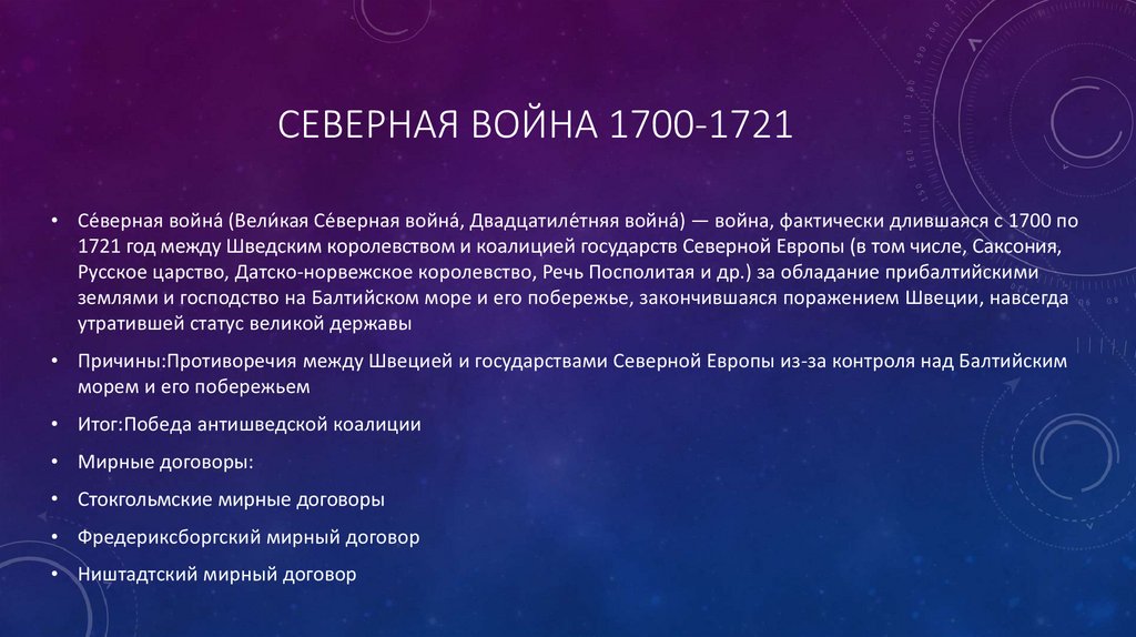 СЕВЕРНАЯ ВОЙНА 1700-1721• Се́верная война́ (Вели́ кая Се́верная война́, Двадцатиле́тняя война́) — война, фактически длившаяся с 1700 по
