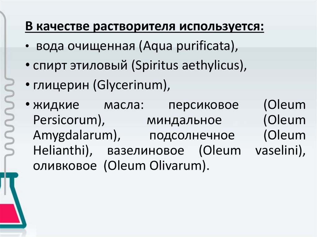 В качестве растворителя используется:• вода очищенная (Aqua purificata),