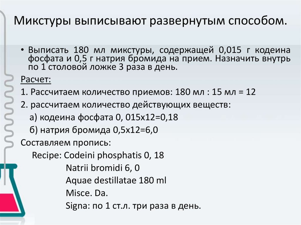 Микстуры выписывают развернутым способом.• Выписать 180 мл микстуры, содержащей 0,015 г кодеина
