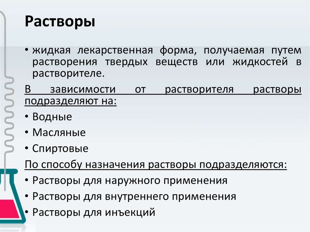 Растворы• жидкая лекарственная форма, получаемая путем