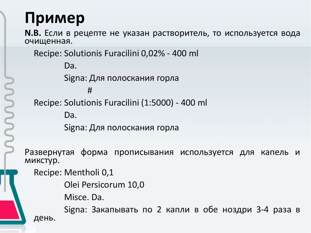 ПримерN.B. Если в рецепте не указан растворитель, то используется вода