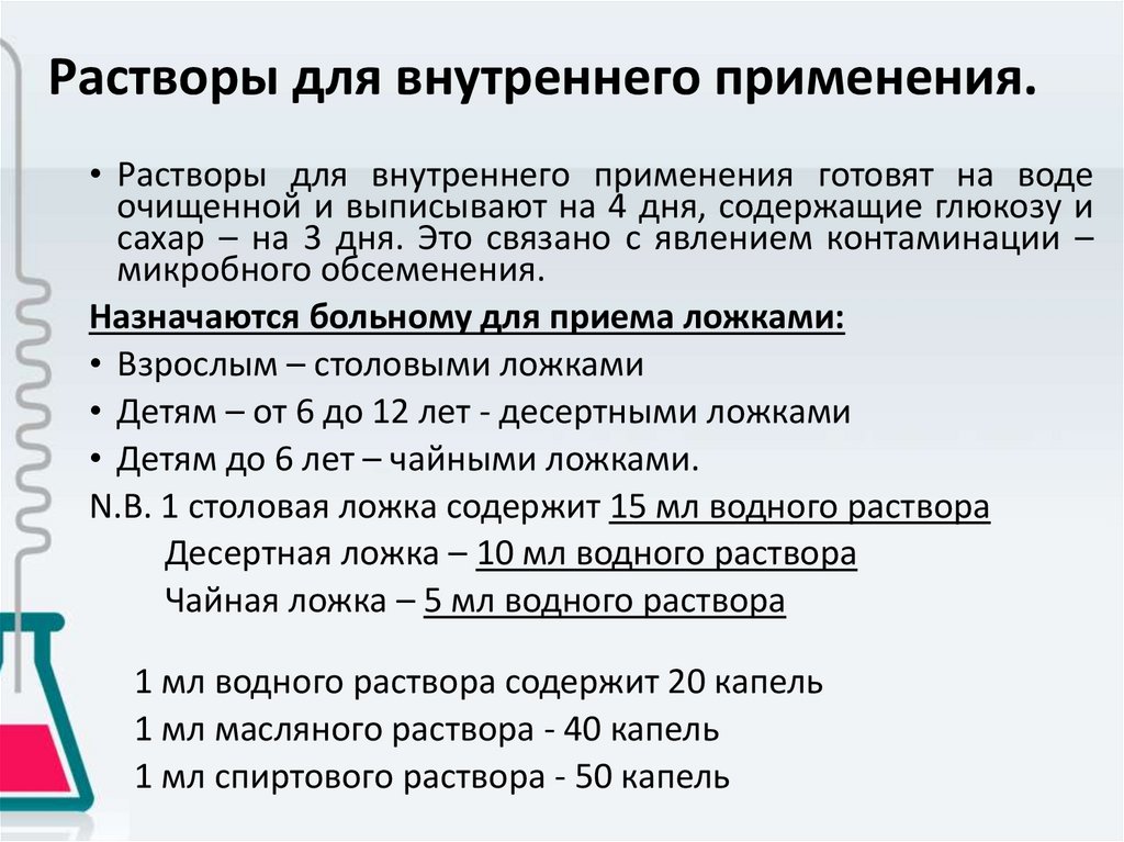 Растворы для внутреннего применения.• Растворы для внутреннего применения готовят на воде