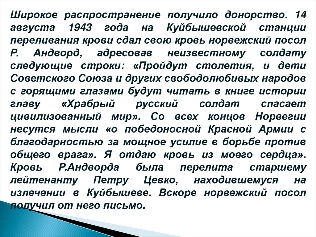 Широкое распространение получило донорство. 14августа 1943 года на Куйбышевской станции