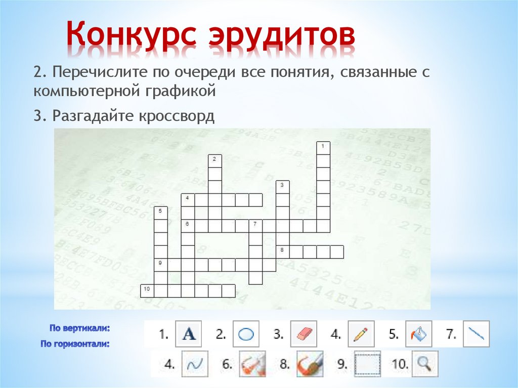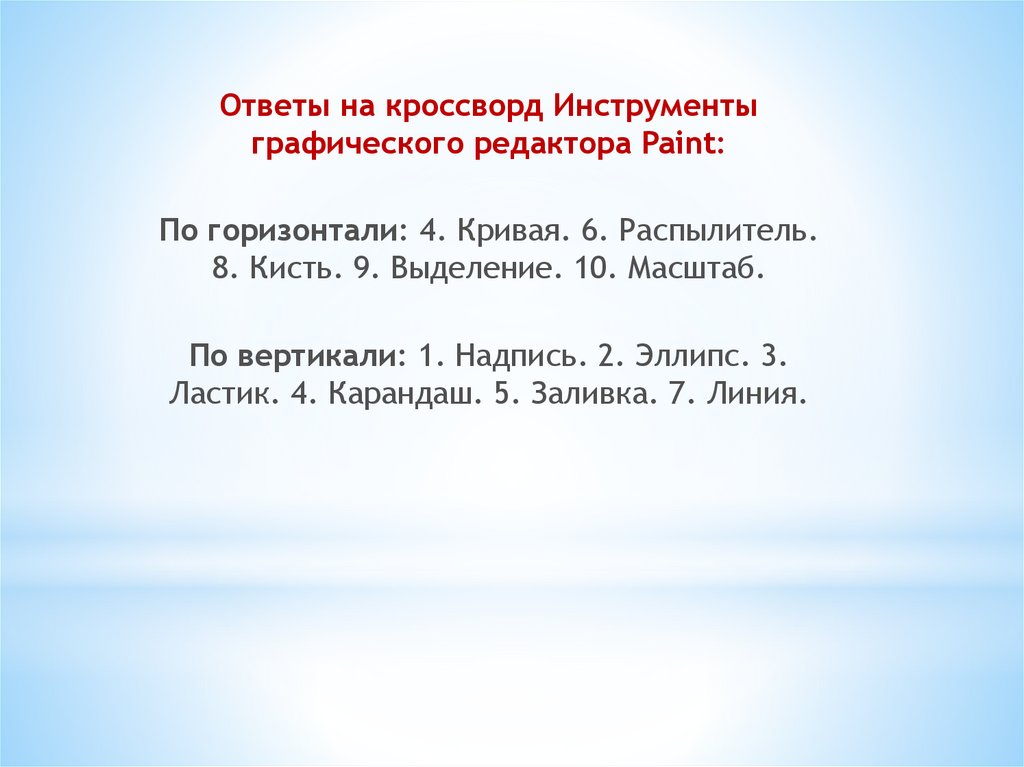 Ответы на кроссворд Инструментыграфического редактора Paint: