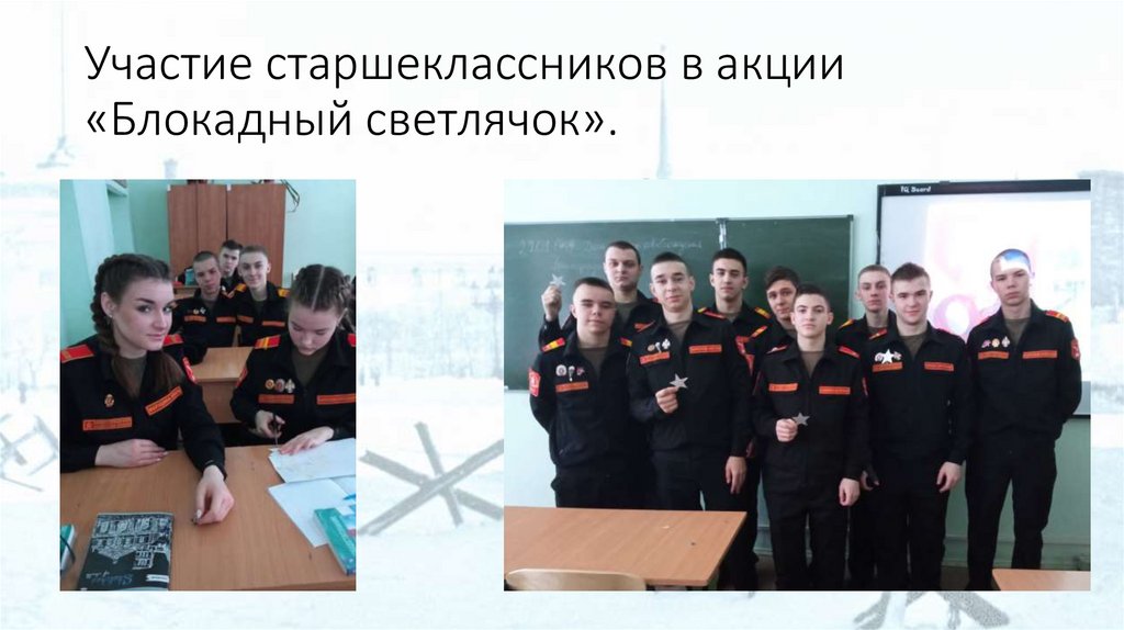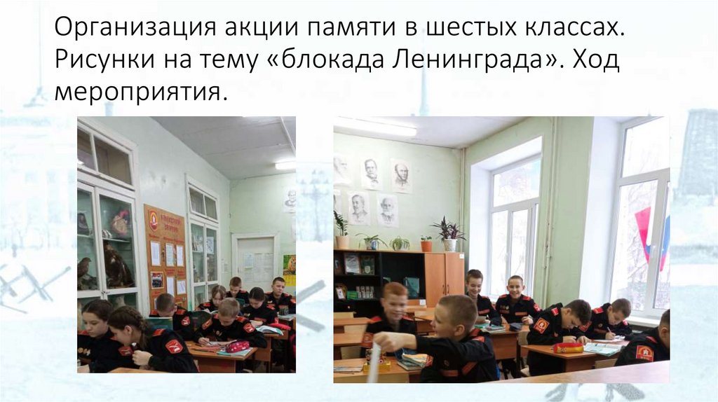 Организация акции памяти в шестых классах.Рисунки на тему «блокада Ленинграда». Ход