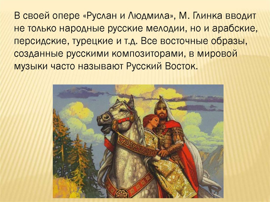 В своей опере «Руслан и Людмила», М. Глинка вводитне только народные русские мелодии, но и арабские,