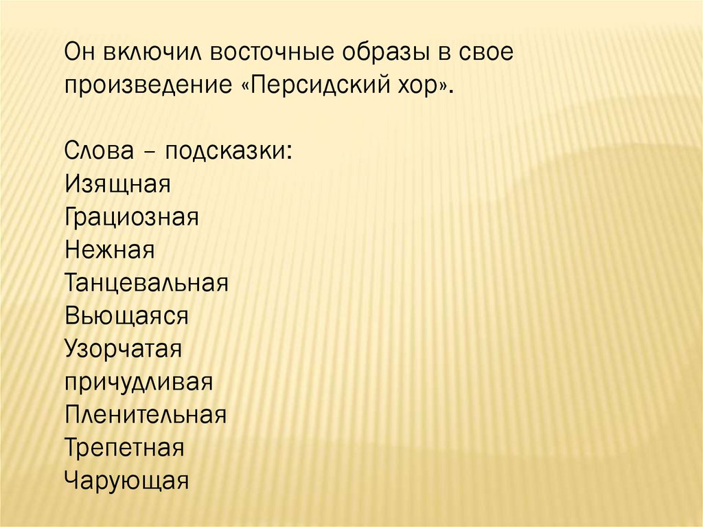 Он включил восточные образы в своепроизведение «Персидский хор».