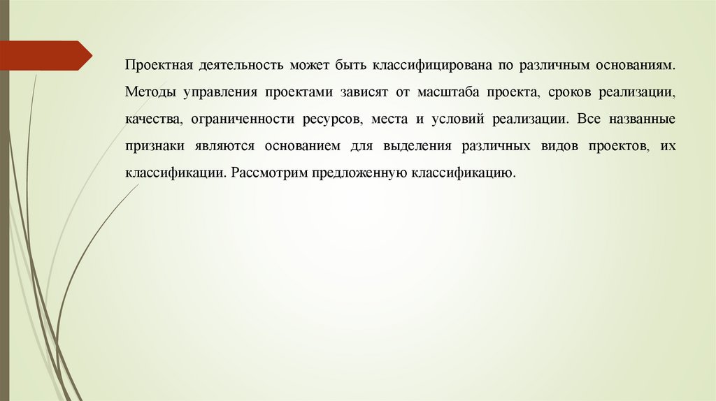Проектная деятельность может быть классифицирована по различным основаниям.Методы управления проектами зависят от масштаба проекта, сроков реализации,