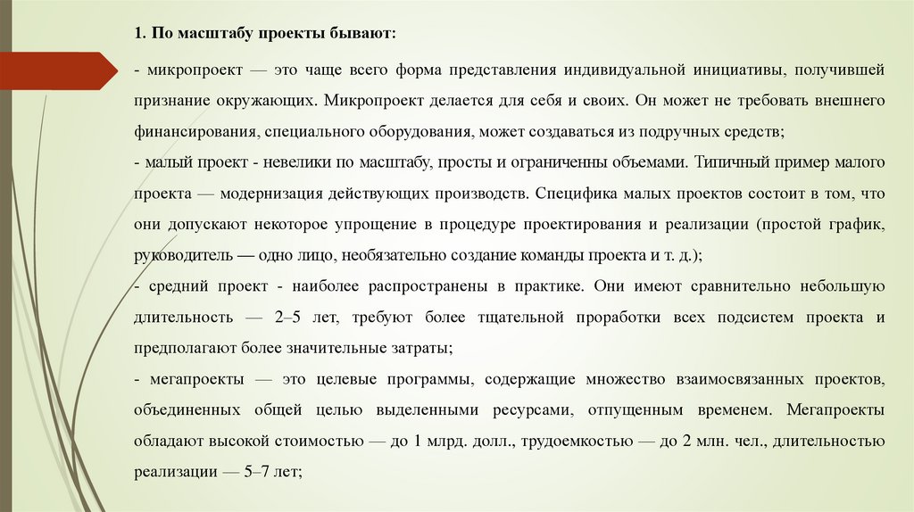 1. По масштабу проекты бывают:- микропроект — это чаще всего форма представления индивидуальной инициативы, получившей