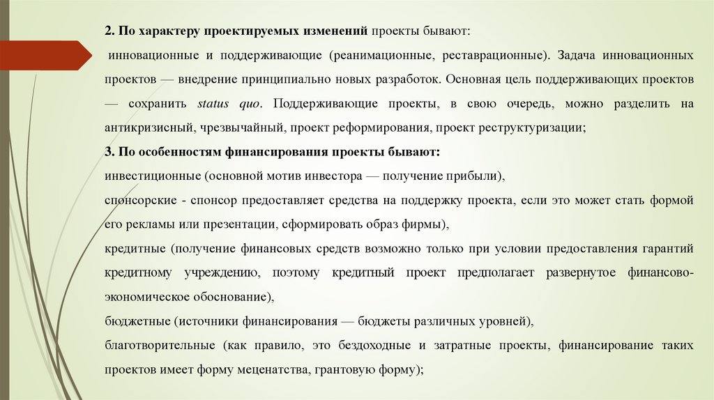 2. По характеру проектируемых изменений проекты бывают:инновационные и поддерживающие (реанимационные, реставрационные). Задача инновационных
