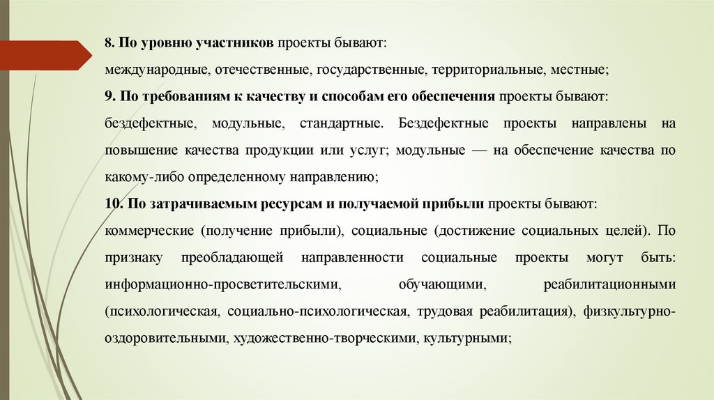8. По уровню участников проекты бывают:международные, отечественные, государственные, территориальные, местные;