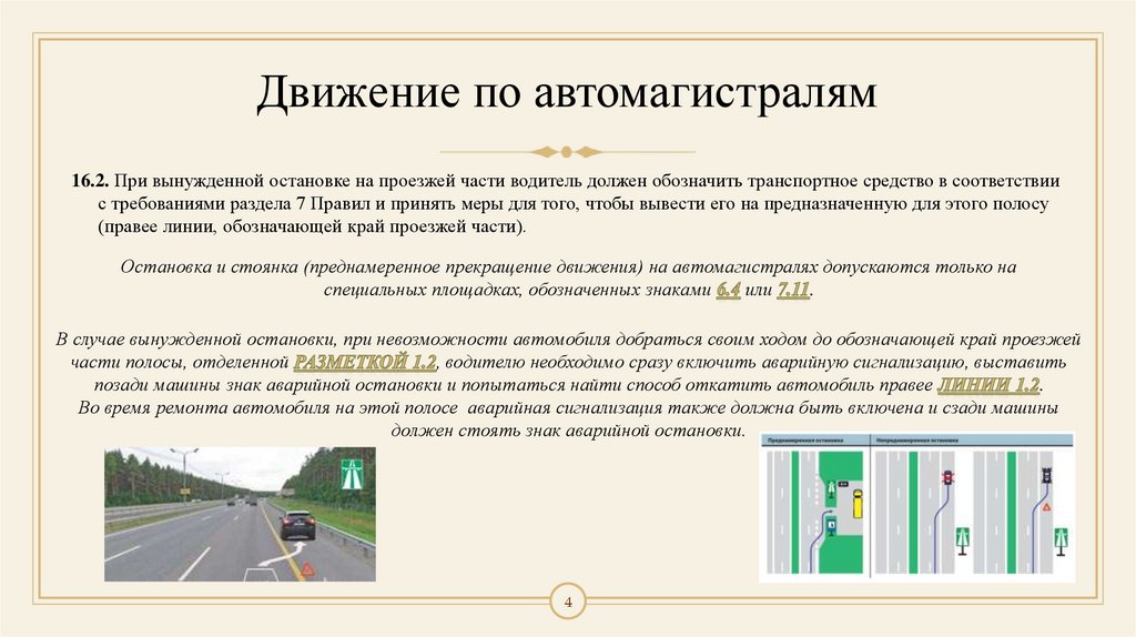 Движение по автомагистралям16.2. При вынужденной остановке на проезжей части водитель должен обозначить транспортное средство в соответствии