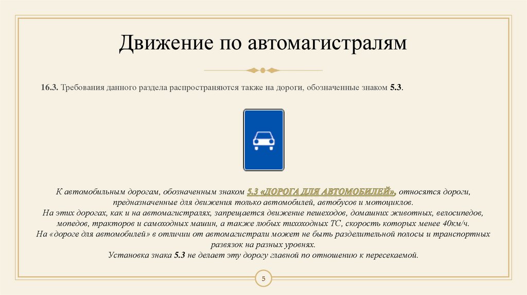 Движение по автомагистралям16.3. Требования данного раздела распространяются также на дороги, обозначенные знаком 5.3.