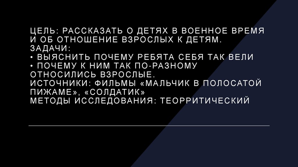 Ц Е Л Ь : РАС С К А З АТ Ь О Д Е ТЯ Х В ВО Е Н Н О Е В Р Е М ЯИ О Б О Т Н О Ш Е Н И Е ВЗ РО СЛ Ы Х К Д Е ТЯ М .