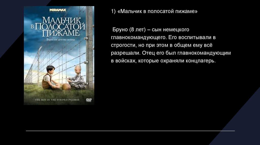 1) «Мальчик в полосатой пижаме»Бруно (8 лет) – сын немецкого