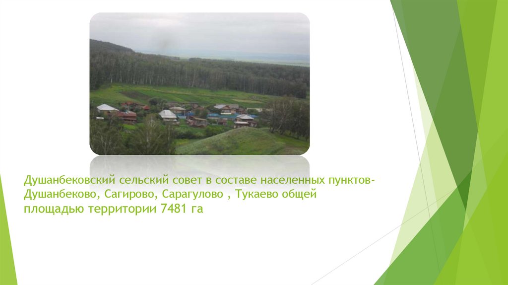 Душанбековский сельский совет в составе населенных пунктовДушанбеково, Сагирово, Сарагулово , Тукаево общейплощадью территории 7481 га
