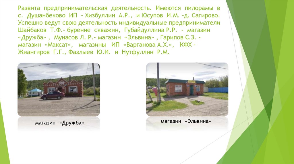 «Дружба» , Мунасов Л. Р.- магазин «Эльвина» , Гарипов С.З. магазин «Максат», магазины ИП «Варганова А.Х.», КФХ Жиангиров Г.Г., Фазлыев Ю.И. и Нутфуллин Р.М.