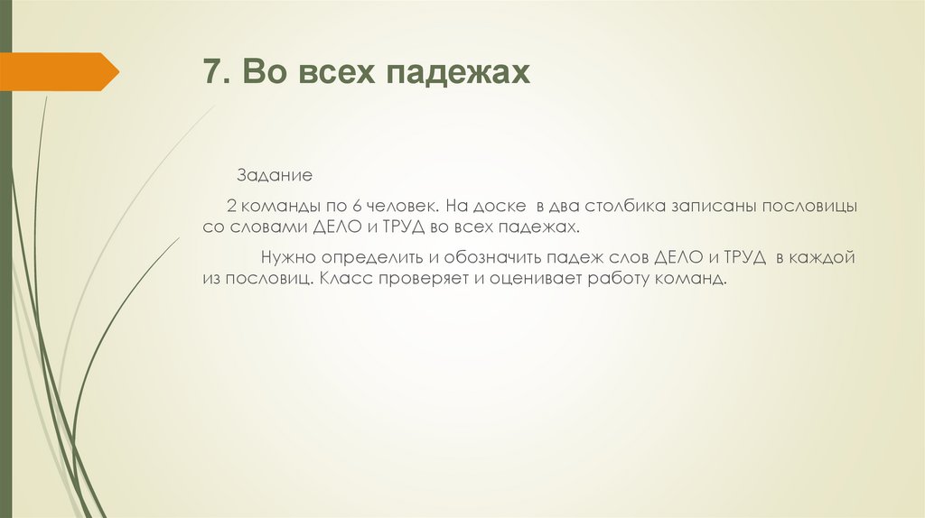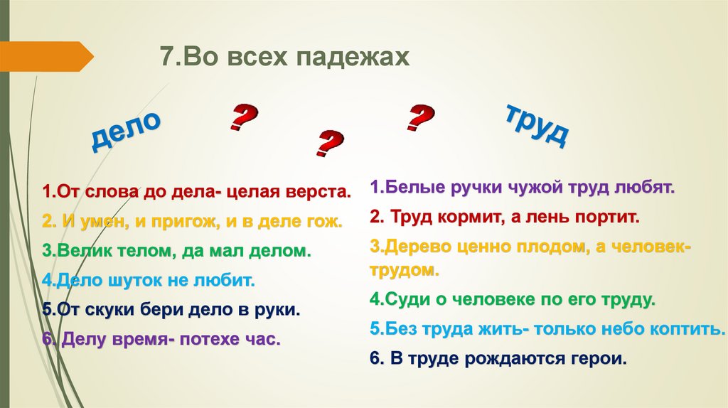 7.Во всех падежах1.От слова до дела- целая верста. 1.Белые ручки чужой труд любят.