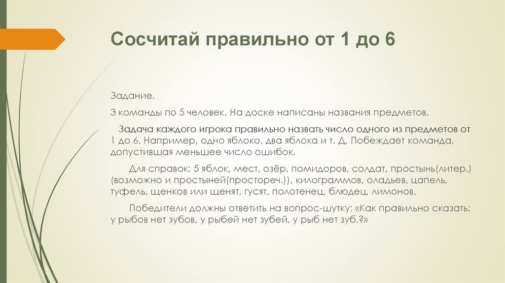 1 до 6. Например, одно яблоко, два яблока и т. Д. Побеждает команда,