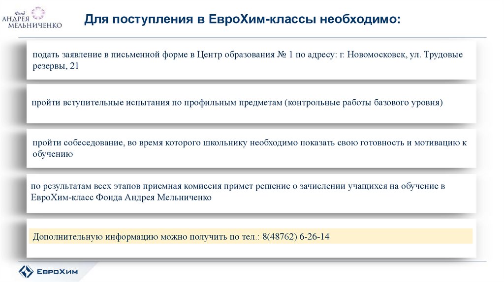 Для поступления в ЕвроХим-классы необходимо:подать заявление в письменной форме в Центр образования № 1 по адресу: г. Новомосковск, ул. Трудовые