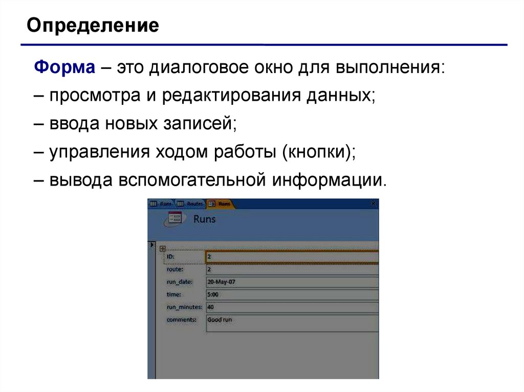 ОпределениеФорма – это диалоговое окно для выполнения:
