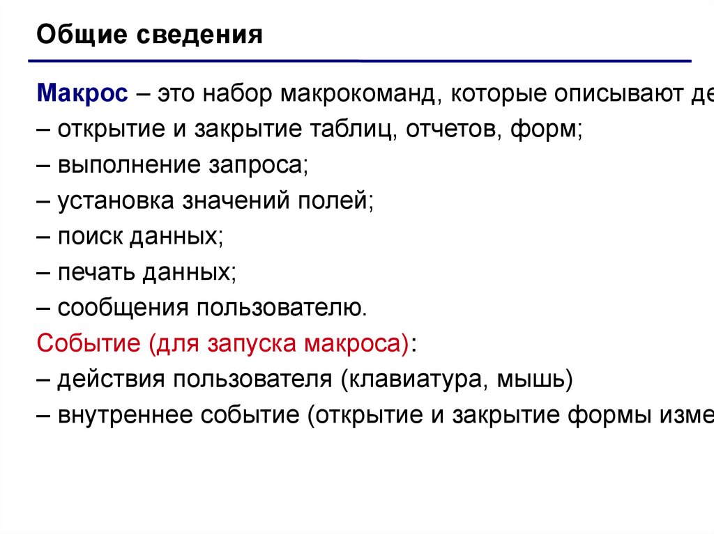 Общие сведенияМакрос – это набор макрокоманд, которые описывают де