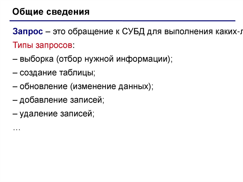 Общие сведенияЗапрос – это обращение к СУБД для выполнения каких-л