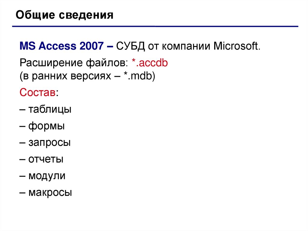 Общие сведенияMS Access 2007 – СУБД от компании Microsoft.