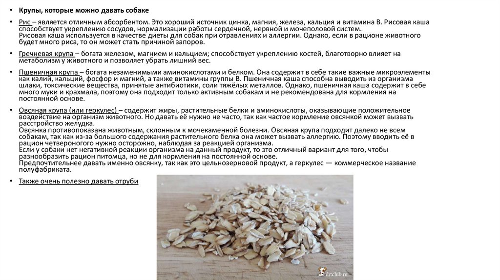 • Крупы, которые можно давать собаке• Рис – является отличным абсорбентом. Это хороший источник цинка, магния, железа, кальция и витамина В. Рисовая каша