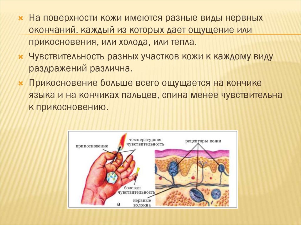 На поверхности кожи имеются разные виды нервныхокончаний, каждый из которых дает ощущение или
