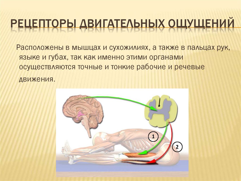 РЕЦЕПТОРЫ ДВИГАТЕЛЬНЫХ ОЩУЩЕНИЙРасположены в мышцах и сухожилиях, а также в пальцах рук,