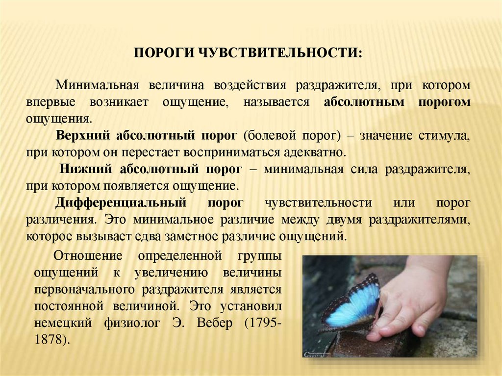 ПОРОГИ ЧУВСТВИТЕЛЬНОСТИ:Минимальная величина воздействия раздражителя, при котором