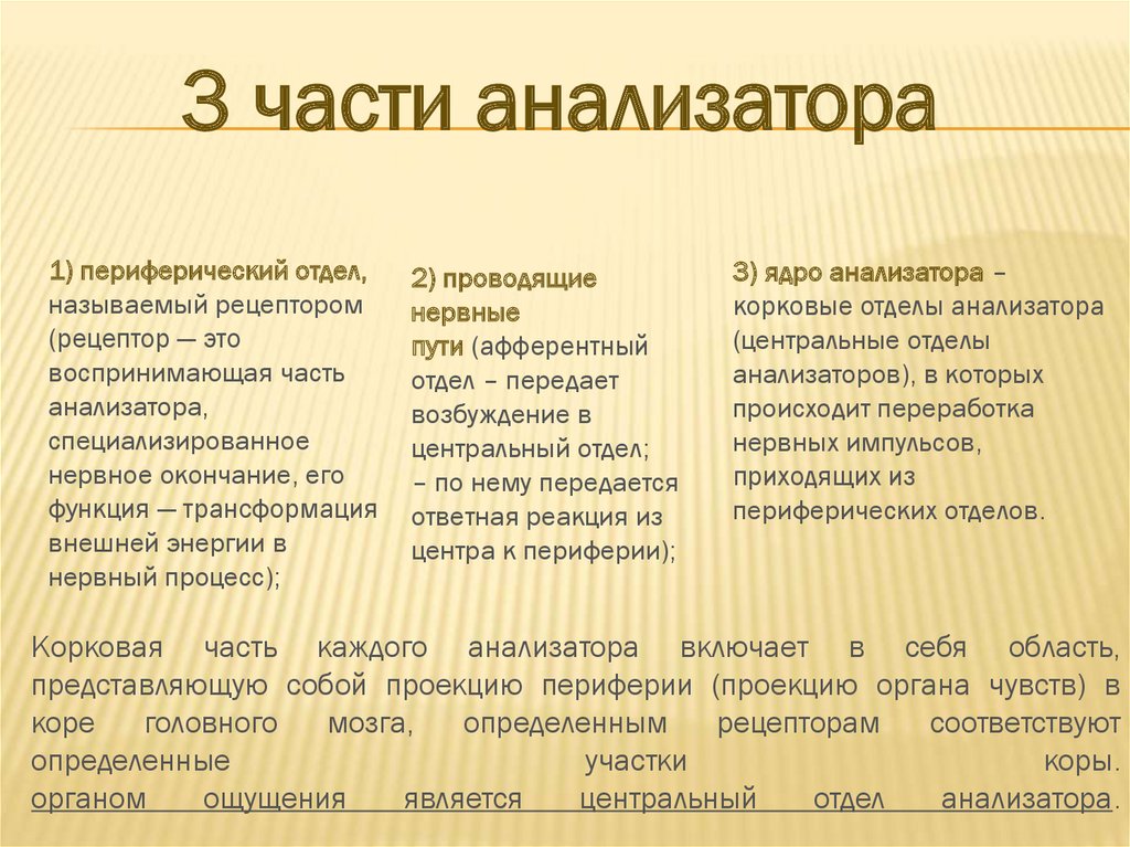 аппаратом ощущений служат анализаторы, которые состоят из рецептора(глаз, ухо, вкусовые луковицы и т.д.) нервных путей и соответствующего участка
