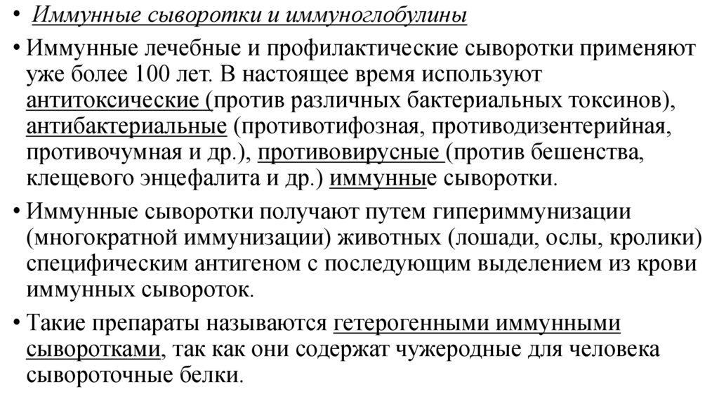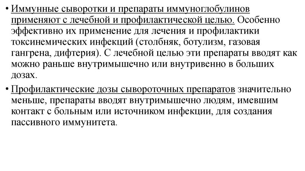 • Иммунные сыворотки и препараты иммуноглобулиновприменяют с лечебной и профилактической целью. Особенно