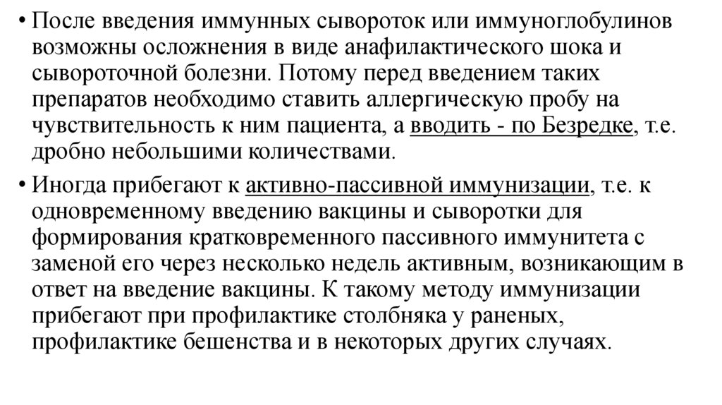 • После введения иммунных сывороток или иммуноглобулиноввозможны осложнения в виде анафилактического шока и