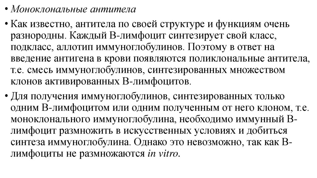 синтеза иммуноглобулина. Однако это невозможно, так как Влимфоциты не размножаются in vitro.