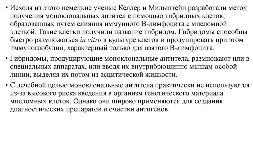 • Исходя из этого немецкие ученые Келлер и Мильштейн разработали методполучения моноклональных антител с помощью гибридных клеток,