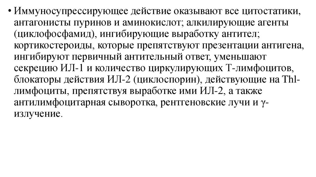 • Иммуносупрессирующее действие оказывают все цитостатики,антагонисты пуринов и аминокислот; алкилирующие агенты