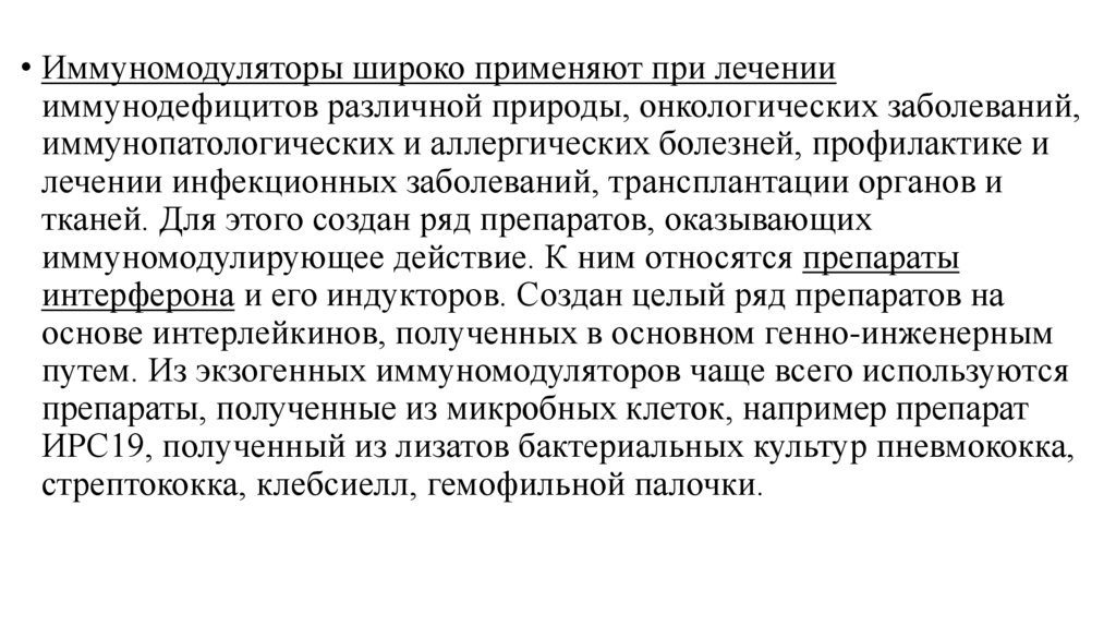 • Иммуномодуляторы широко применяют при лечениииммунодефицитов различной природы, онкологических заболеваний,