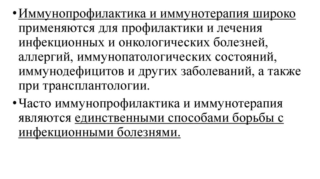 • Иммунопрофилактика и иммунотерапия широкоприменяются для профилактики и лечения