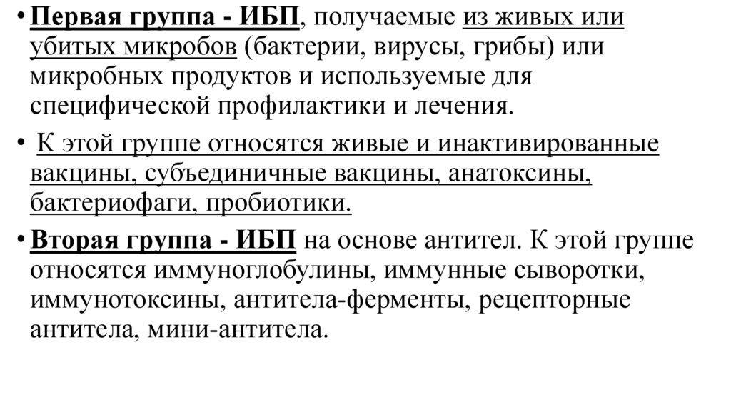 • Первая группа - ИБП, получаемые из живых илиубитых микробов (бактерии, вирусы, грибы) или