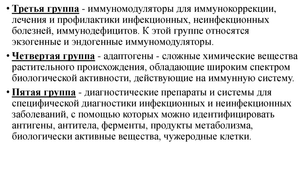• Третья группа - иммуномодуляторы для иммунокоррекции,лечения и профилактики инфекционных, неинфекционных