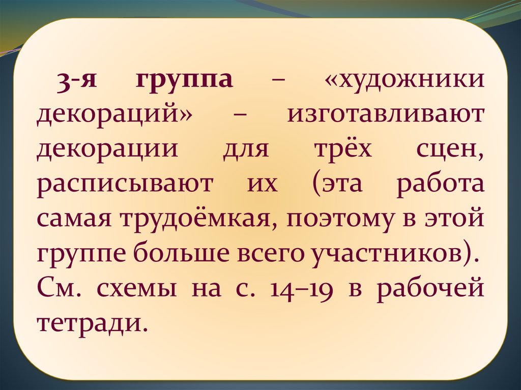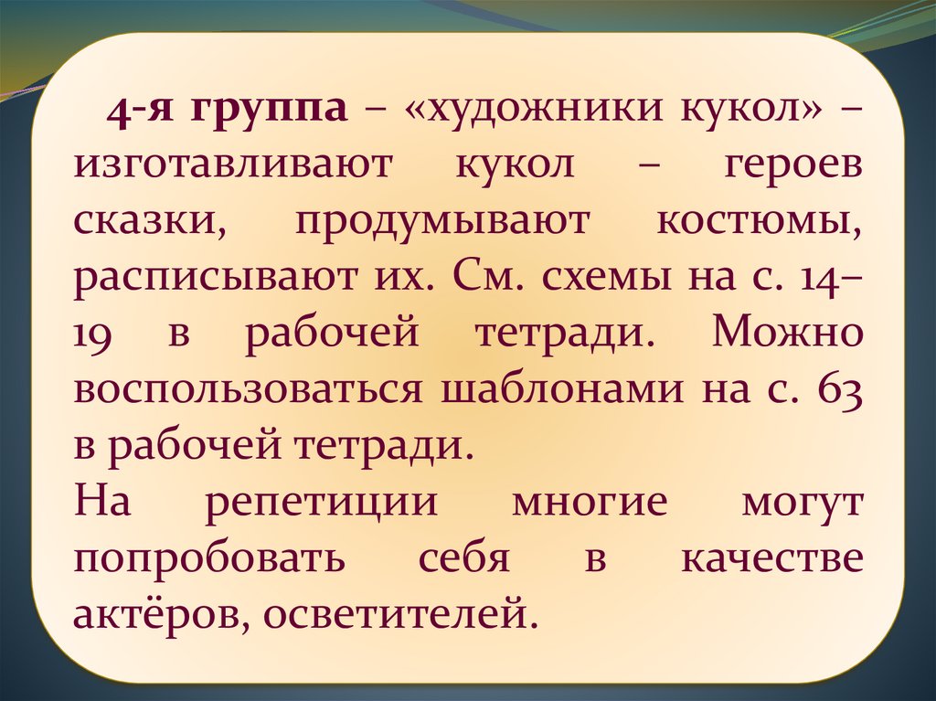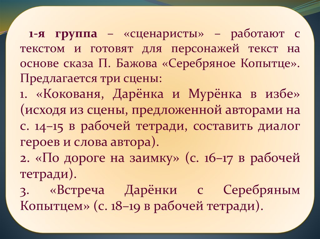 1-я группа – «сценаристы» – работают стекстом и готовят для персонажей текст на
