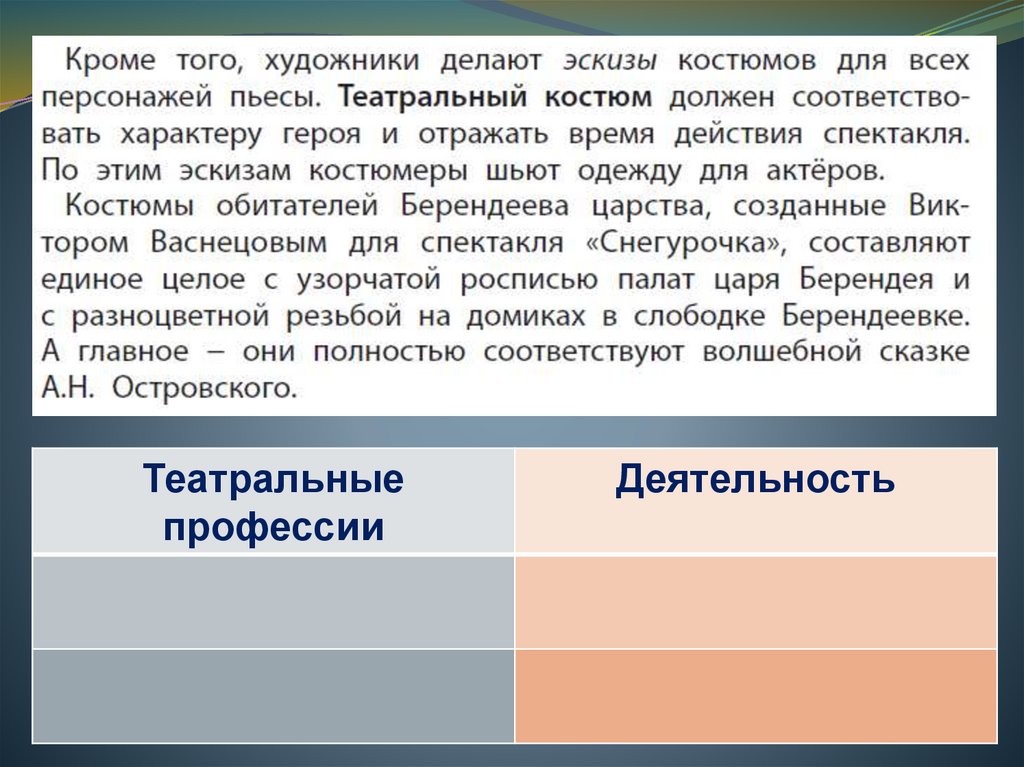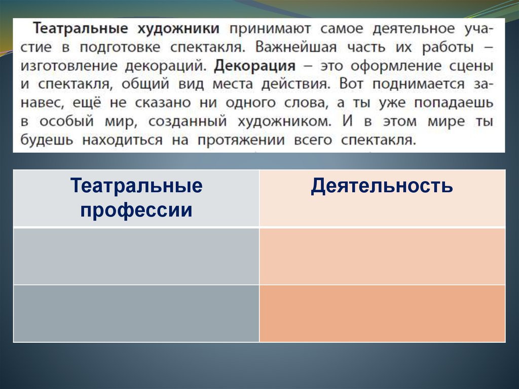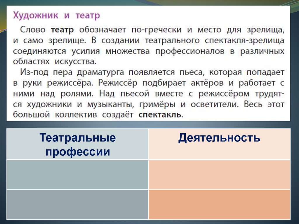 Прочитайте текст и напишите в тетради или альбометеатральные профессии в первом столбике и то, что