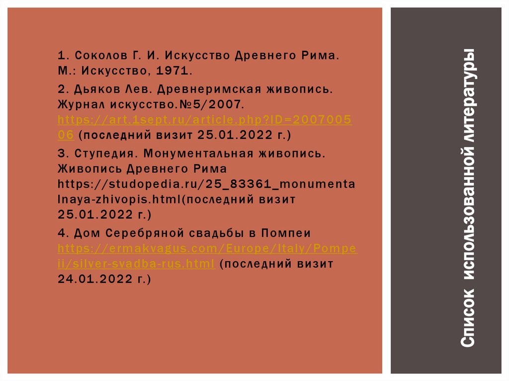 Список использованной литературы1. 1 . Соколов Г. И. Искусс тво Древнего Рима.