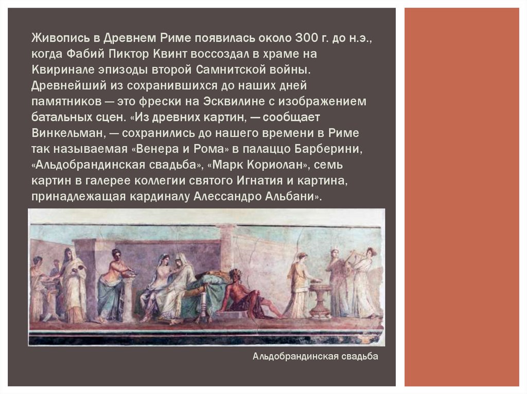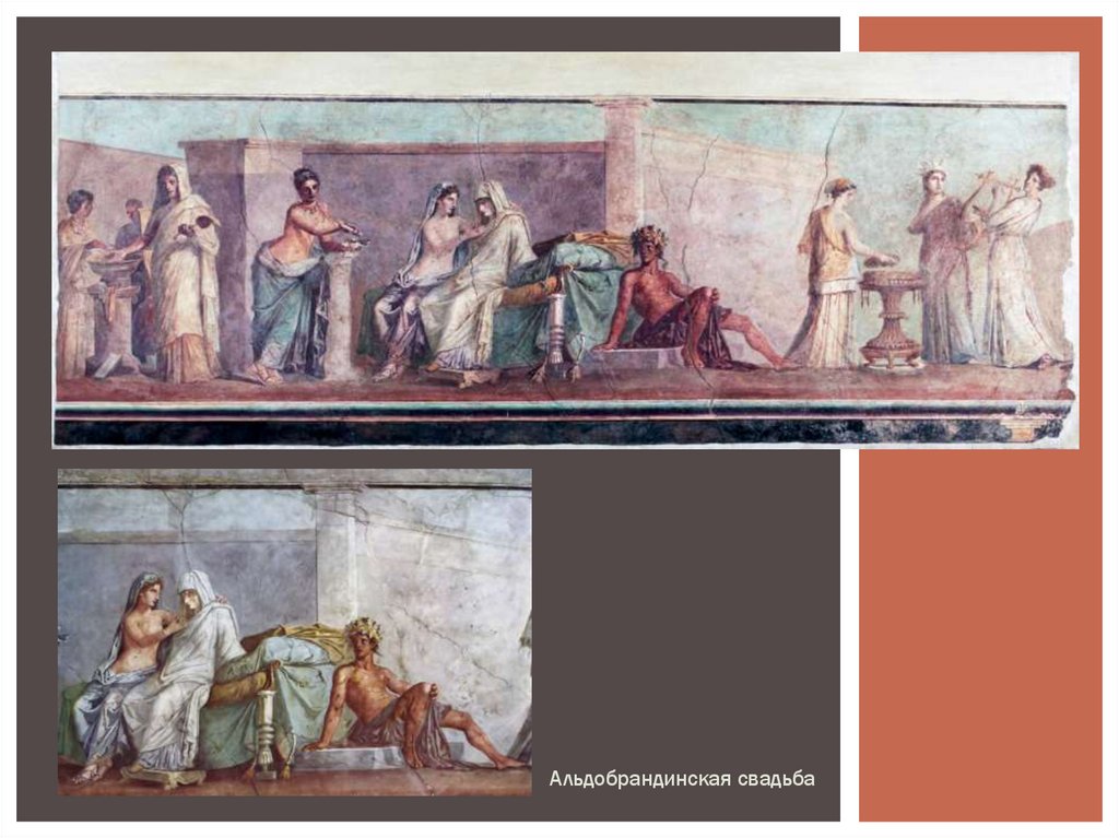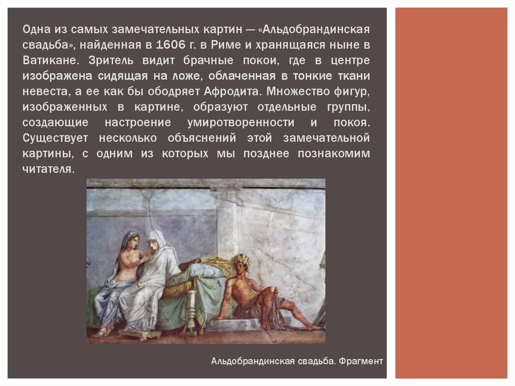 Одна из самых замечательных картин — «Альдобрандинскаясвадьба», найденная в 1606 г. в Риме и хранящаяся ныне в