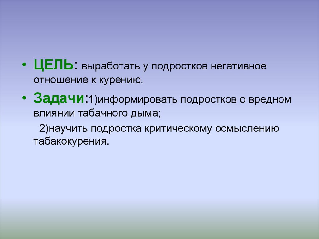 • ЦЕЛЬ: выработать у подростков негативноеотношение к курению.