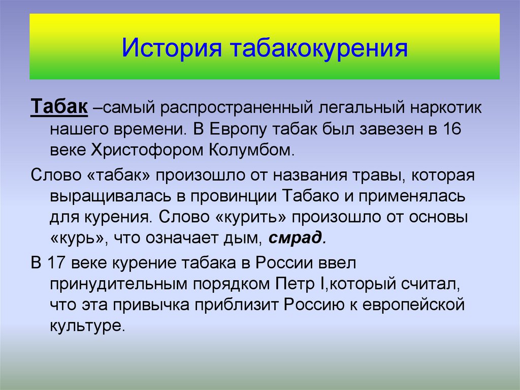 История табакокуренияТабак –самый распространенный легальный наркотик