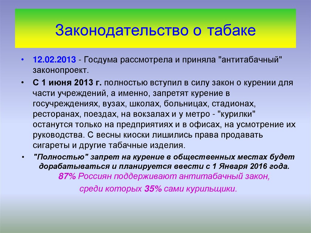 Законодательство о табаке• 12.02.2013 - Госдума рассмотрела и приняла "антитабачный"