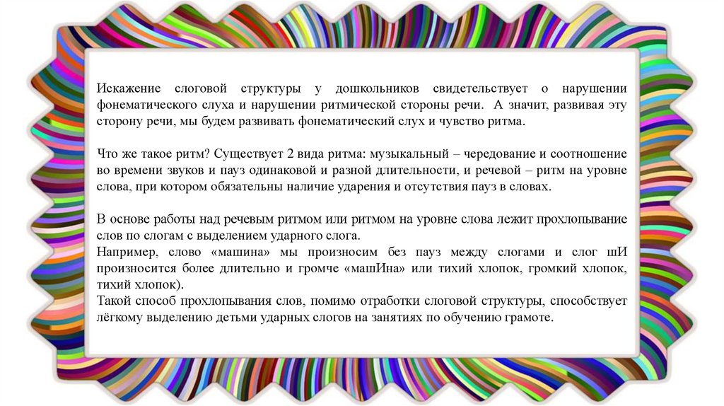 Искажение слоговой структуры у дошкольников свидетельствует о нарушениифонематического слуха и нарушении ритмической стороны речи. А значит, развивая эту